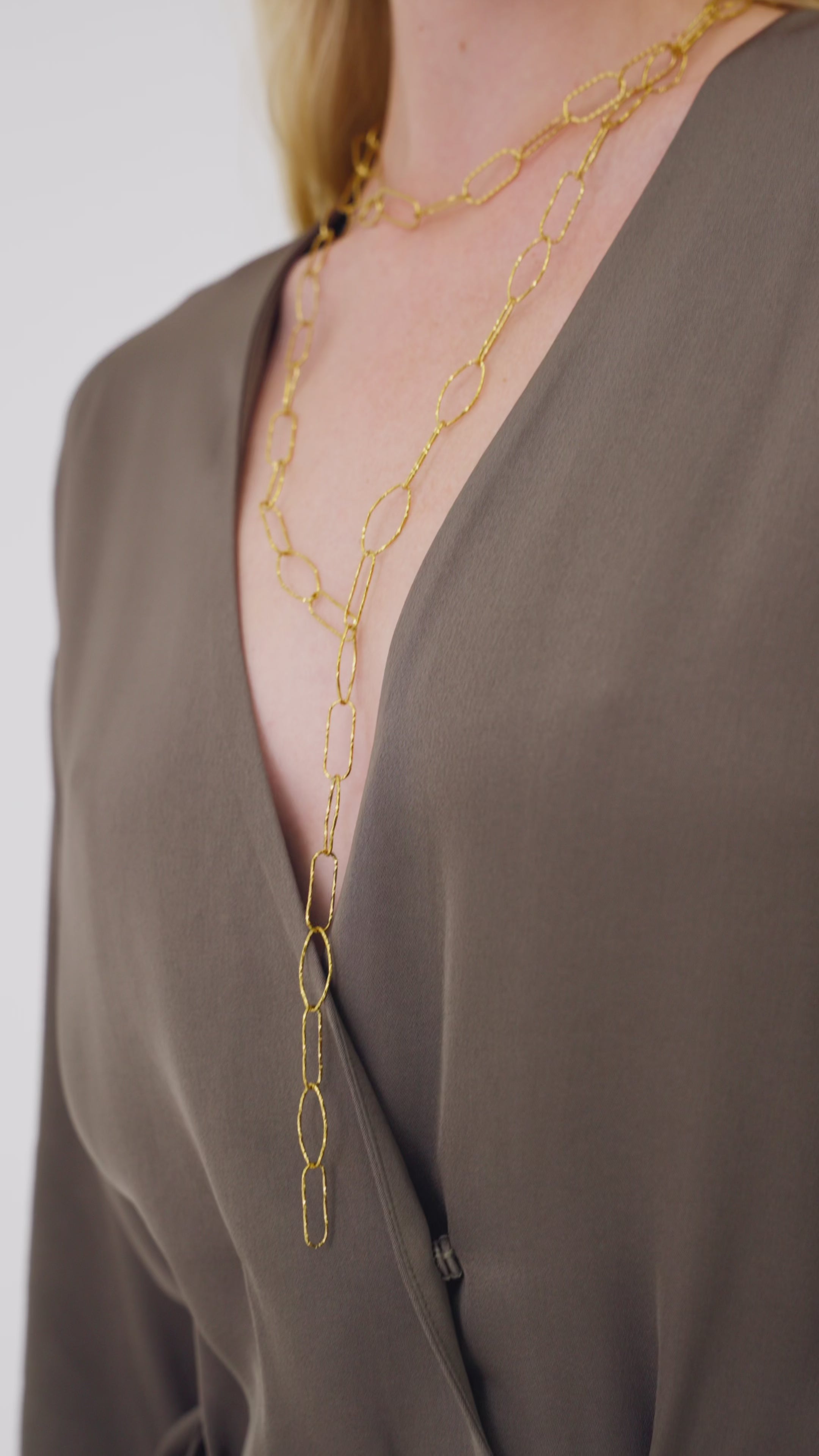 Collana lunga con catena a maglie leggere e struttura lineare. Un accessorio elegante e contemporaneo che slancia la figura e completa con stile ogni outfit.