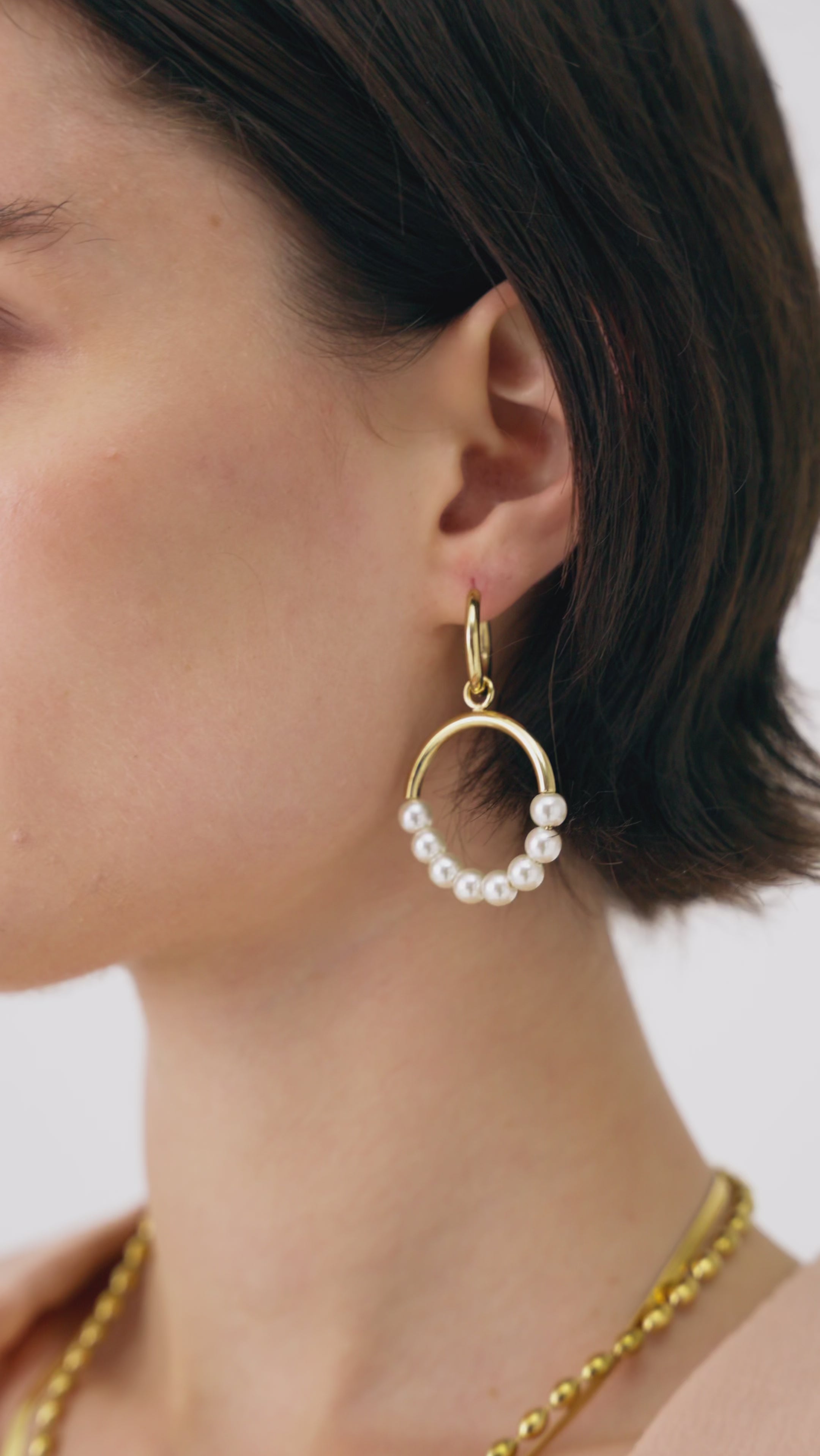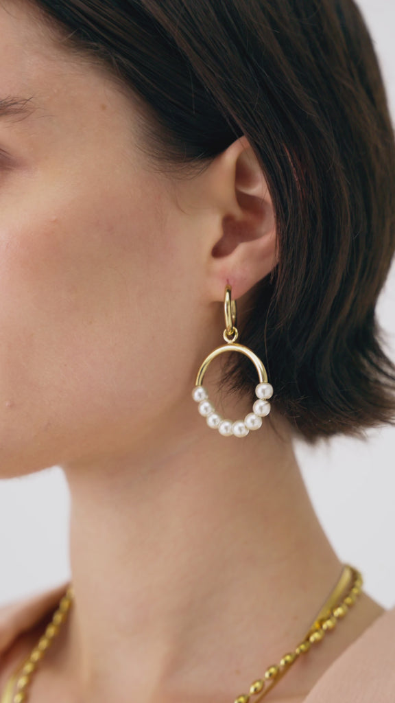 Orecchini pendenti con cerchio e perle, caratterizzati da un design elegante e senza tempo. Il cerchio dorato incornicia delicatamente le perle, creando un contrasto luminoso e raffinato. Ideali per occasioni speciali ma anche per impreziosire look da giorno, questi orecchini uniscono classicità e modernità in un unico accessorio.