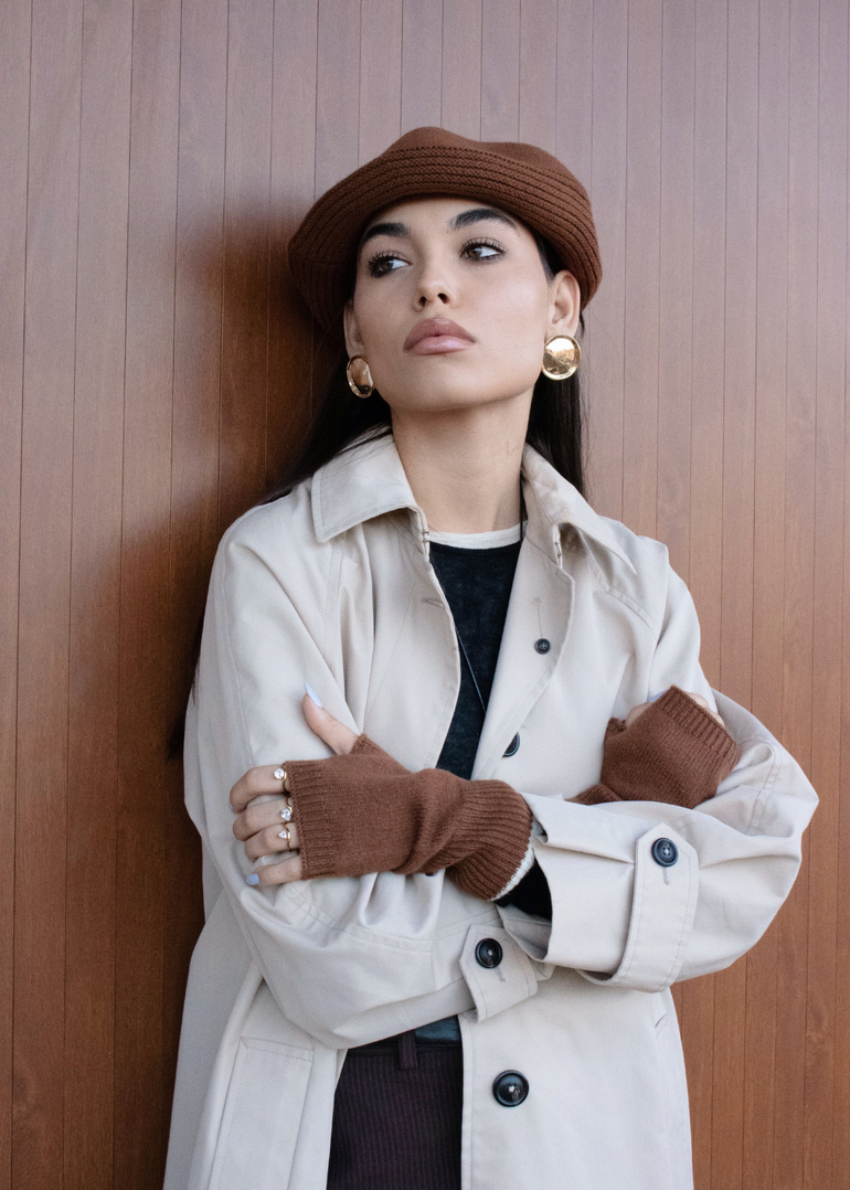 Guanti senza dita in maglia dalla linea pulita e contemporanea, ideali per mantenere le mani al caldo senza rinunciare alla libertà di movimento. Realizzati in filato soffice e confortevole, offrono una vestibilità aderente e un tocco di eleganza discreta. Perfetti da indossare durante le attività quotidiane o per completare look casual e sofisticati nelle giornate più fredde.