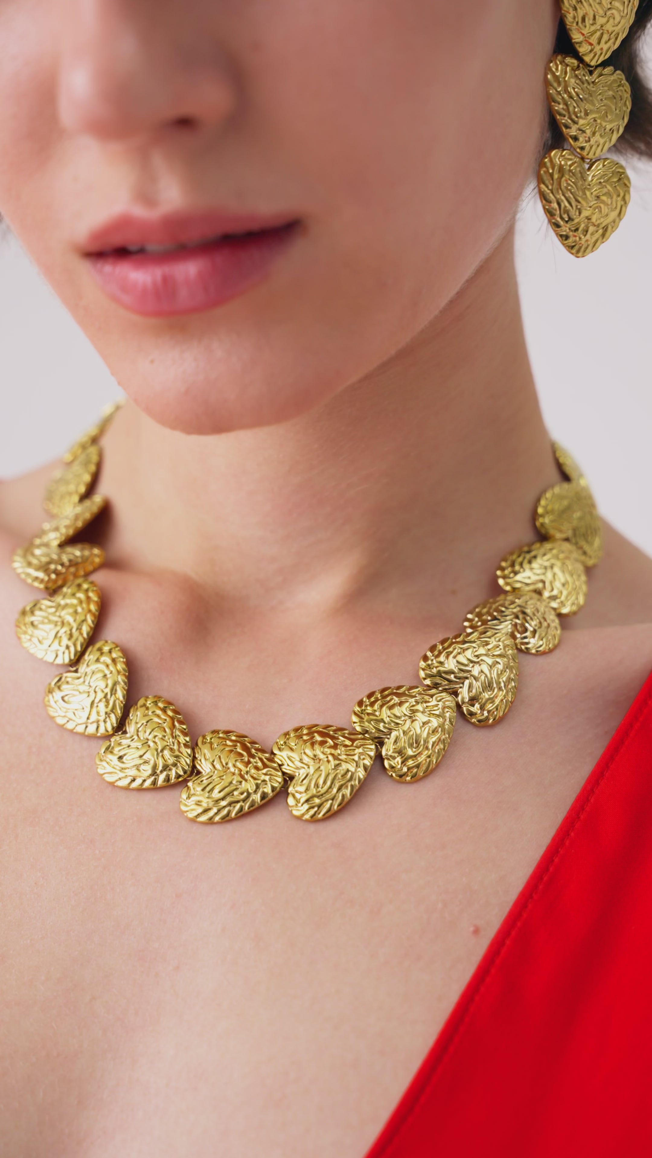 Orecchini pendenti composti da elementi a forma di cuore sovrapposti. La superficie lavorata crea un raffinato gioco di texture, perfetto per aggiungere carattere al look.