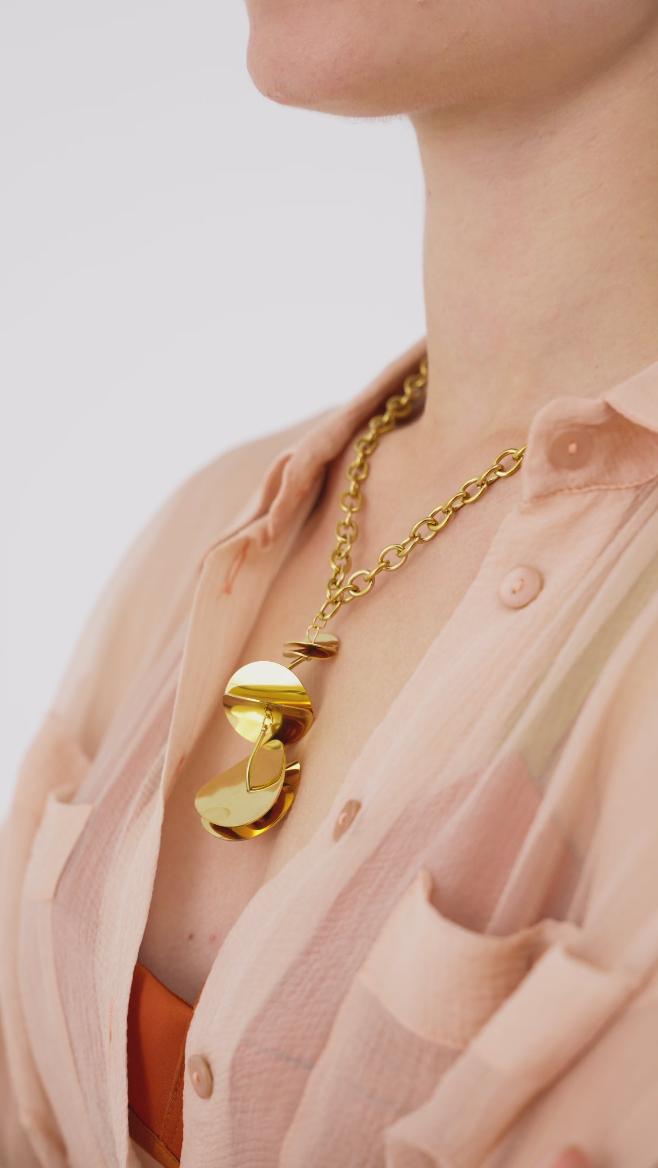Gold-tone chain necklace with a decorative pendant composed of overlapping metal elements with a polished finish. The pendant's sculptural design adds movement and personality, making the piece the centerpiece of any look. Perfect for wearing with simple dresses or deep necklines, it adds a contemporary and elegant touch to any outfit.