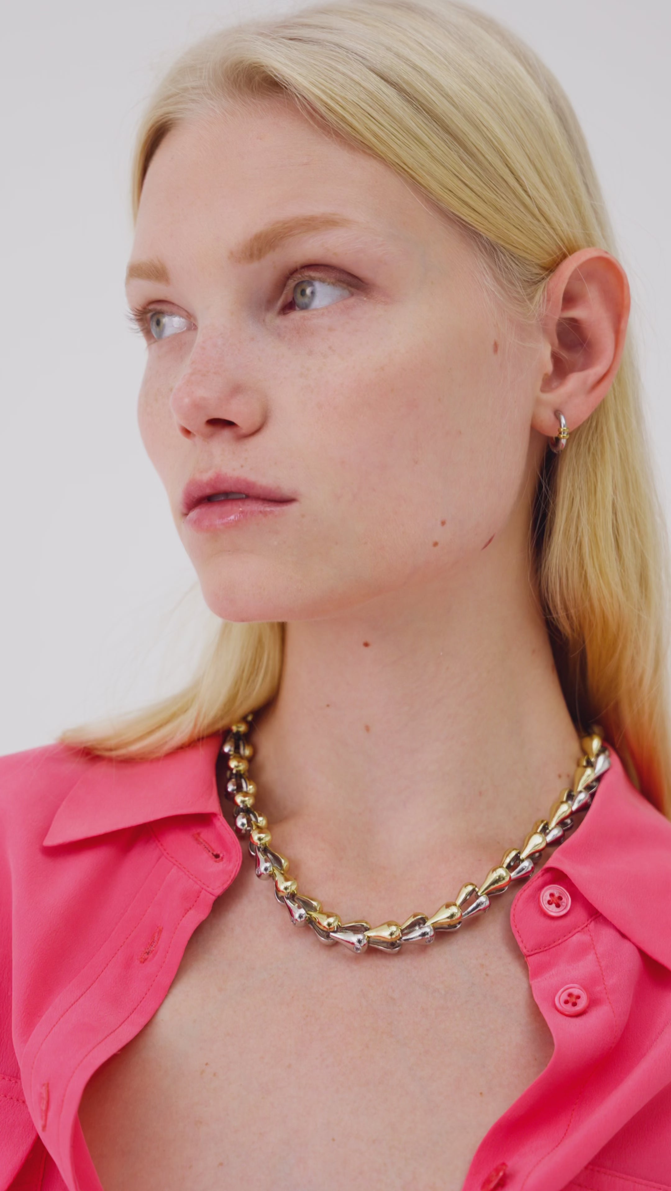 Two-tone necklace with alternating gold and silver-toned shaped links, embellished with small, sparkling crystals. The dynamic and refined design strikes the perfect balance between modernity and femininity. Ideal for both day and night, it accentuates the décolleté with discreet elegance.