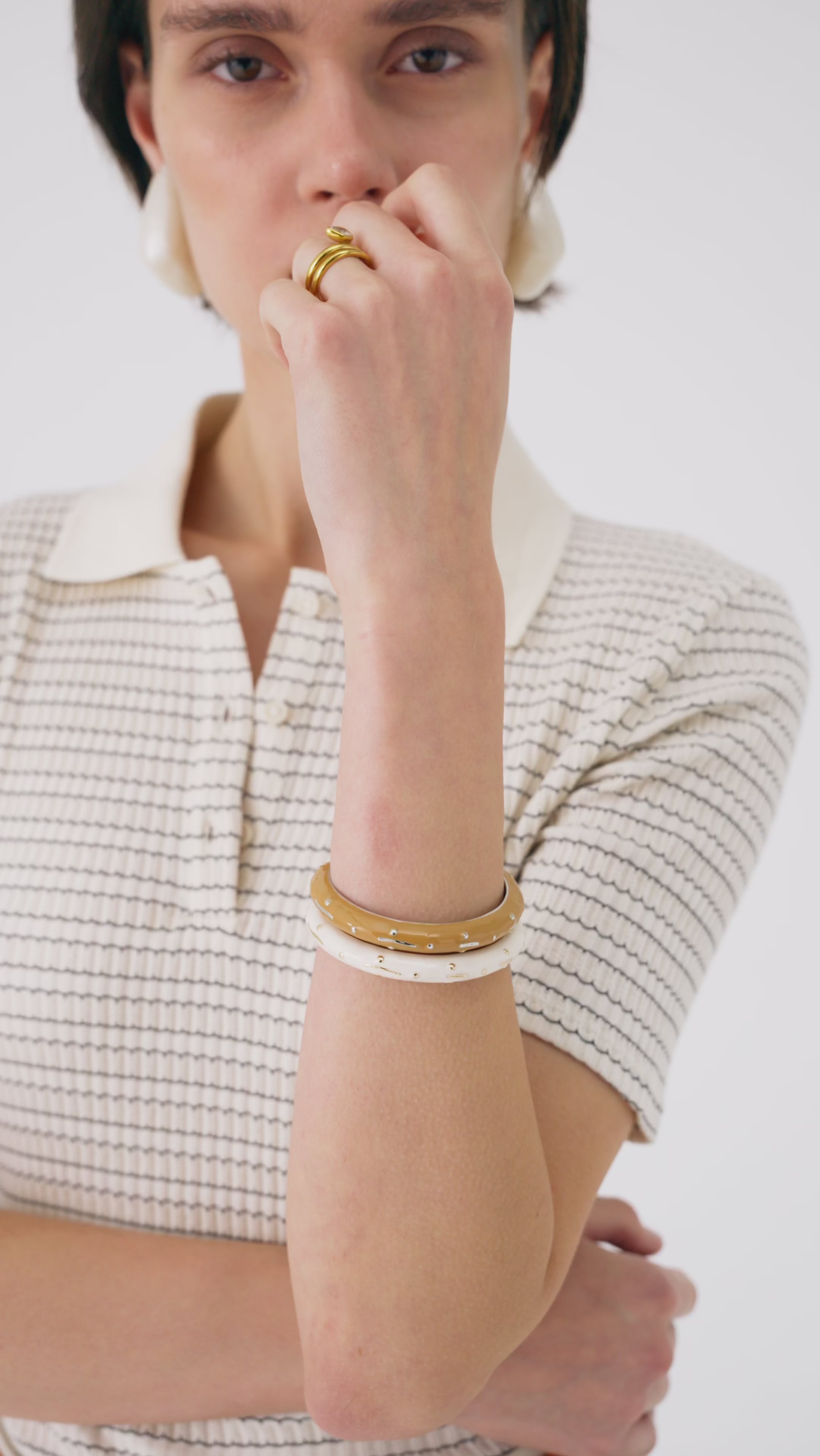 Rigid bracelet with large modules in marbled resin and metal inserts, featuring a voluminous and modern design. The combination of polished surfaces and natural grain creates a striking accessory. Ideal as a statement piece, it enhances both casual and more elegant outfits.
