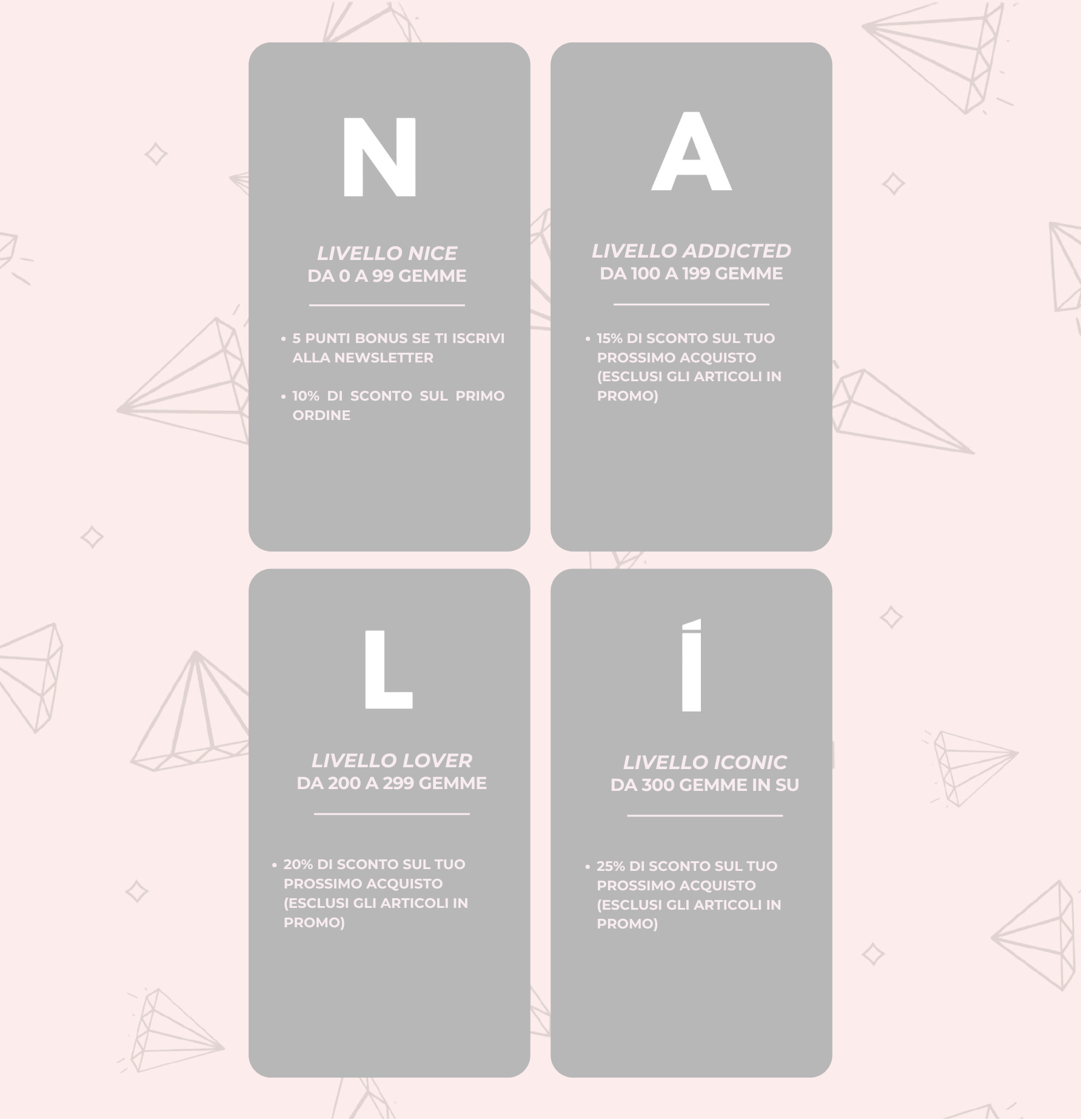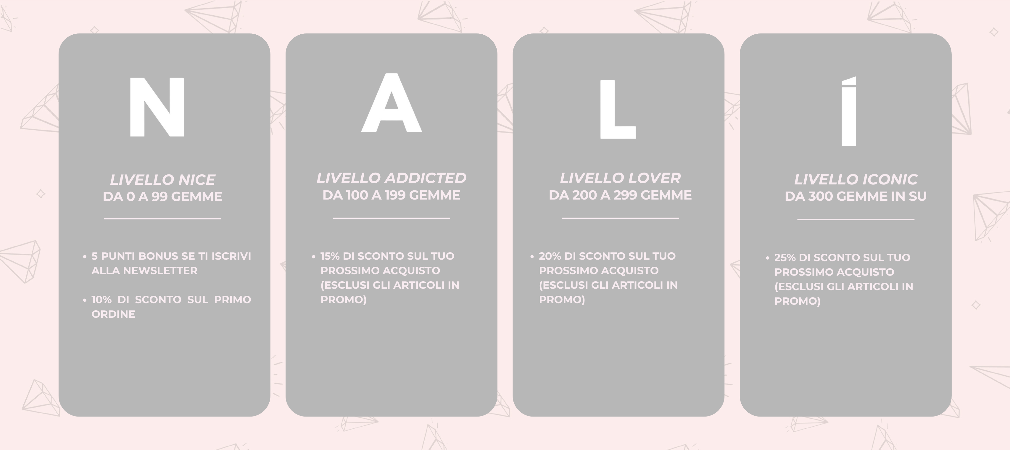 Iscrivendoti al Nalì Club, acquistando online e aggiornando le tue informazioni salirai di livello e potrai sbloccare ricompense super cool. È semplicissimo...