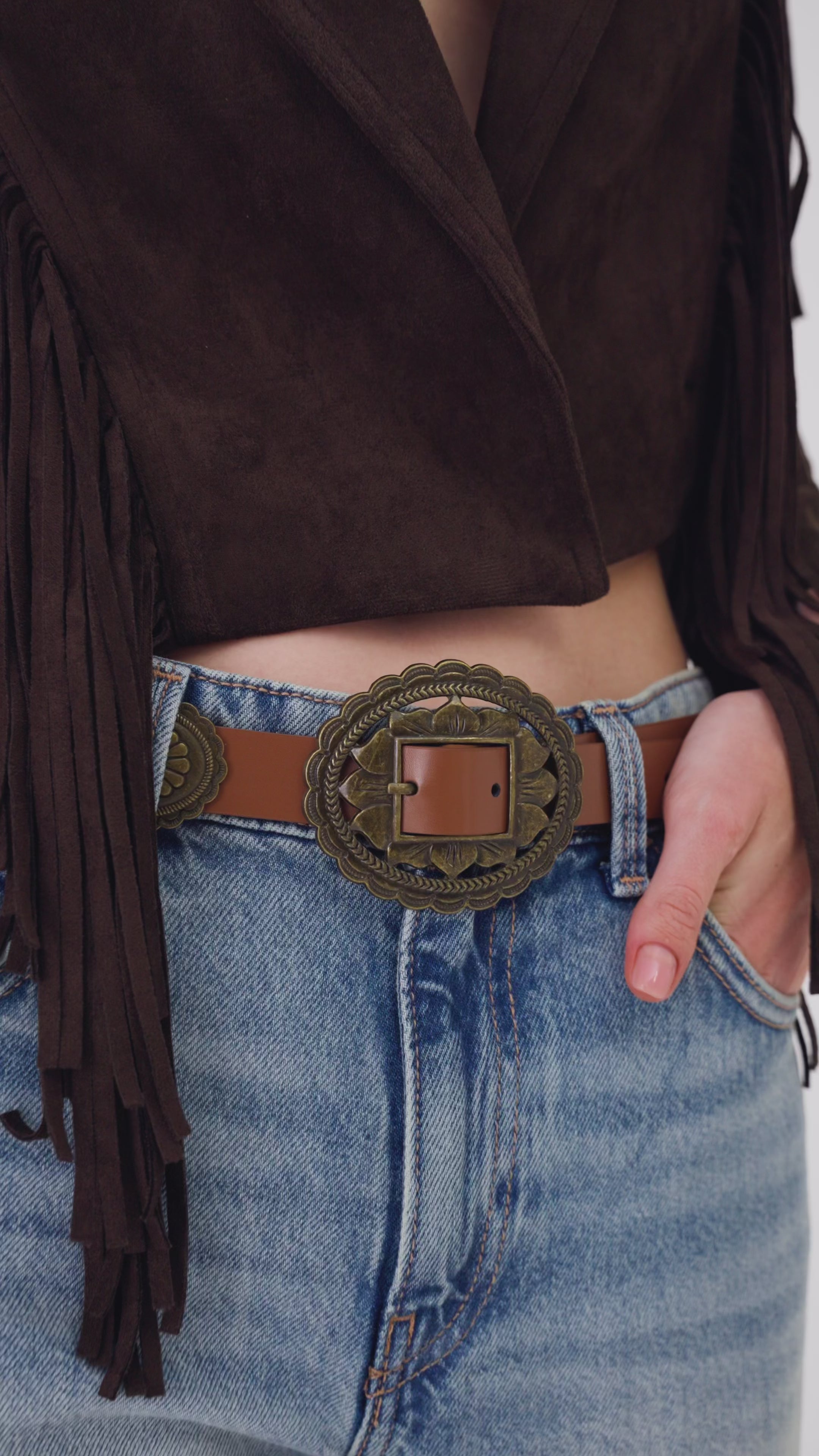 Belt with a textured buckle and decorative elements along the body. A bold style, ideal for sophisticated looks.